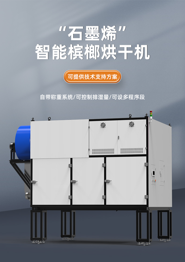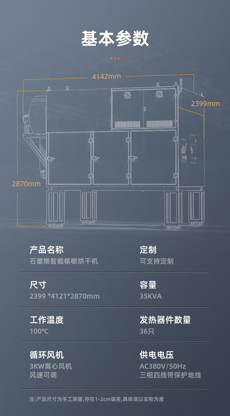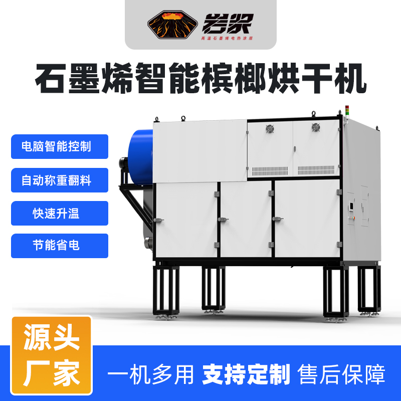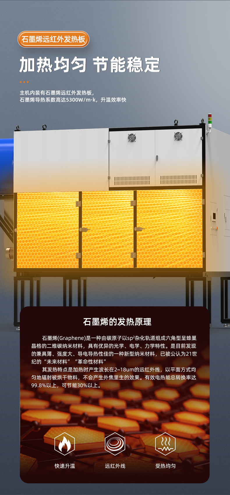 主机内装有石墨烯发热体、保温矿棉、不锈钢支架等;石墨烯产生的热能以波长在 2~18um 的远红外以平面方式均匀地辐射被烘干物料, 电热总转换率达 99.8%以上。